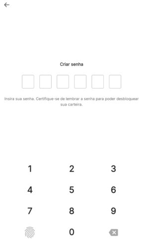 Em seguida você precisará criar uma SENHA de 6 números, para acessar sua carteira, caso use digital você poderá alterar para isso depois.