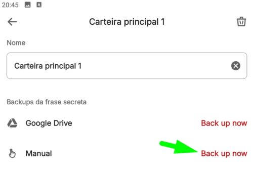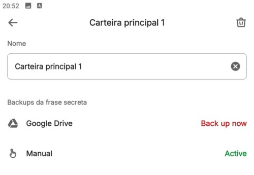 Depois de confirmar as palavras, o BACKUP UP NOW sumirá e será confirmado que você já tem as palavras, com a mensagem ACTIVE em verde: