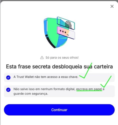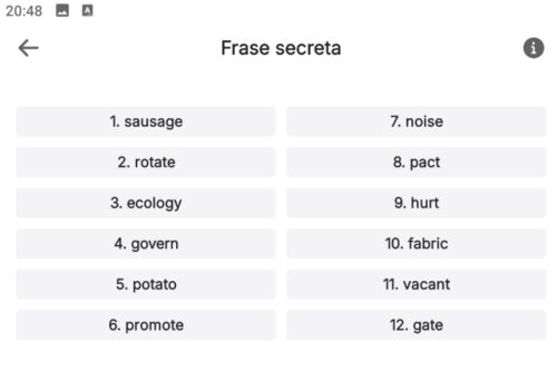 Aqui você terá acesso as 12 palavras, ou frase secreta da sua carteira, você deve anotar elas em PAPEL e em LETRA minúscula em ordem: