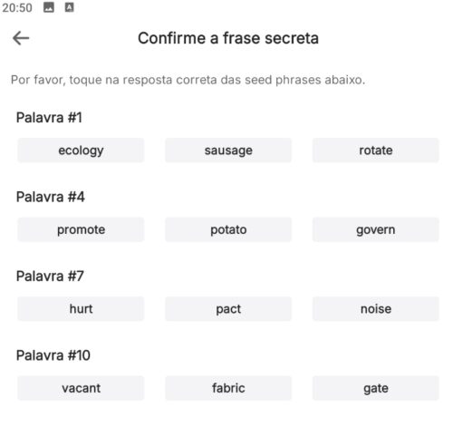 Após escrever as 12 palavras, ou frase secreta clique em continuar, a carteira vai pedir algumas palavras pra confirmar que você anotou elas corretamente na ordem: