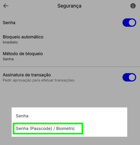 Depois, voltei para as Configurações clicando na engrenagem e vá em SEGURANÇA, digite sua SENHA de 6 dígitos e em MÉTODO DE BLOQUEIO, clique para alterar para SENHA (PASSCODE) / BIOMETRIC, aqui vai ativar a função de Biometria por Digital também (caso não use sua digital, não ative!)