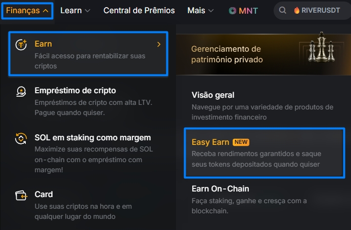 Se estiver no PC: FINANÇAS > EASY EARN ou GANHO FÁCIL;