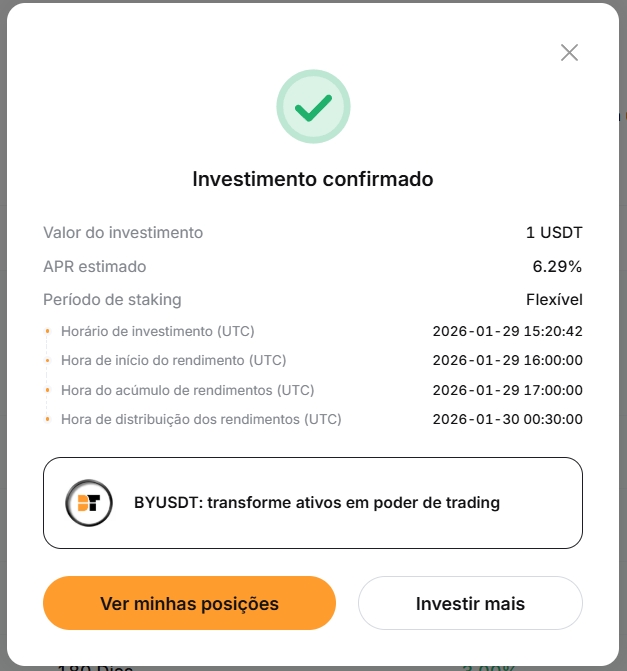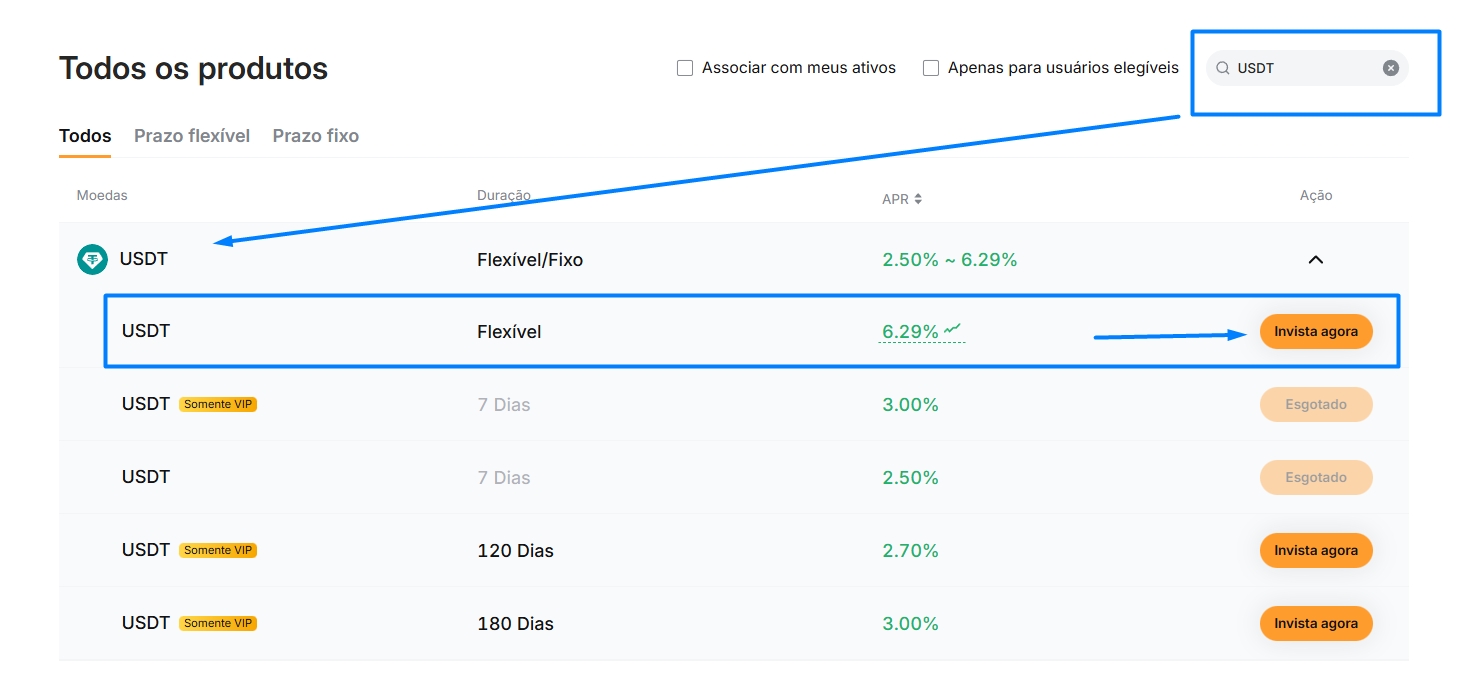 Você vai ver uma tela com diversas criptomoedas, ali você deve escolher USDT e em seguida na forma FLEXÍVEL. Neste formato, o resgate pode ser feito de imediato sem custo caso queira parar.