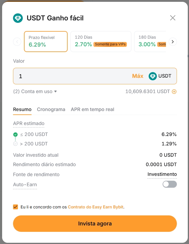 Em seguida você vai ir em INVISTA AGORA e colocar 1 USDT ou a quantidade que tiver desejada:
